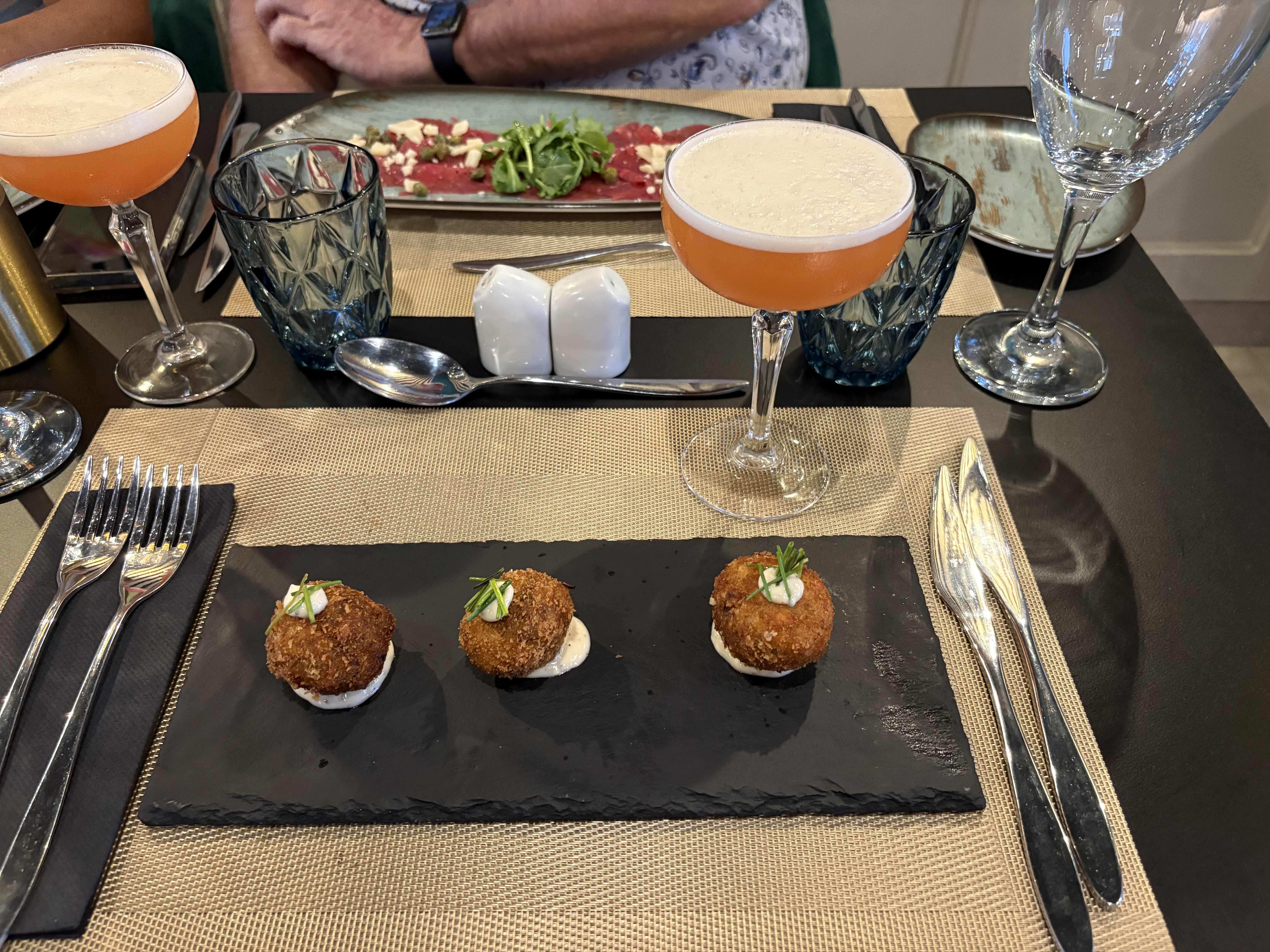 We kozen als voorgerecht voor een beef carpaccio en short rib croquettes. Twee klassiekers die hier netjes in balans gebracht worden: fris en verfijnd bij de carpaccio, hartig en rijk bij de kroketjes.