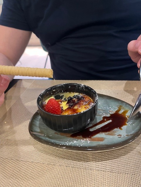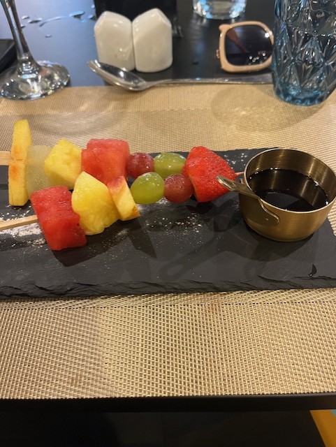 Het dessert was een mix van zoete verleiding: crème brûlée, ijs en een fruitspies met chocolade. Alleen jammer dat de chocolade koud geserveerd werd, wat de afsluiter net iets minder feestelijk maakte. Toch bleef het een geslaagde combinatie die mooi aansloot bij het diner.