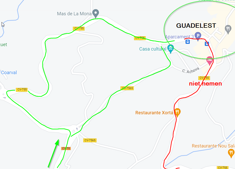 Waarschijnlijk ben je op weg naar Guadelest via de CV-70 gekomen (zie groene wegen hieronder). Wanneer je terug vertrekt uit Guadelest neem dan niet de rode weg, want deze baan is small, kronkelig, op sommige plaatsen éénbaans, en als je fietsers voor je hebt rijden... heel enerverend.