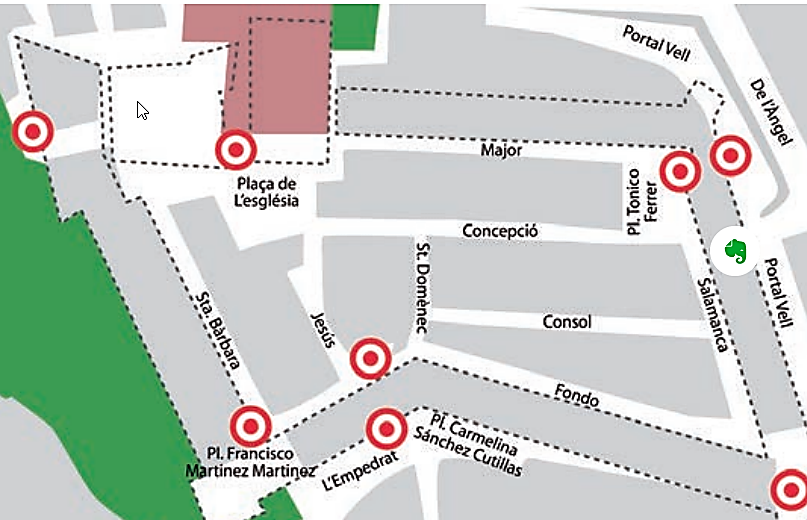 Wanneer je de Portal Vell nadert kan je onderstaand plannetje gebruiken. Het uiteindelijke doel is uit te komen op de Plaça de L’església.
