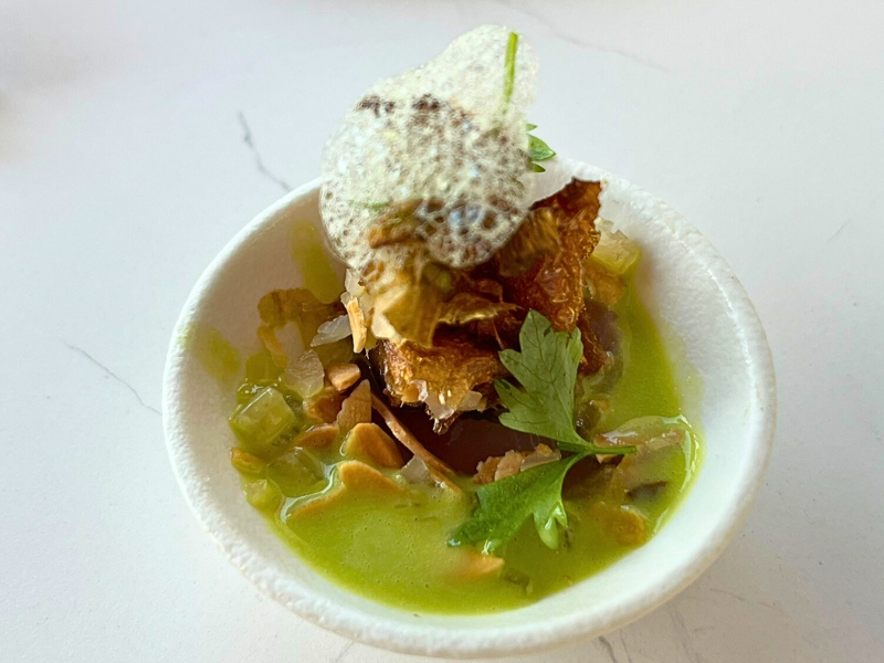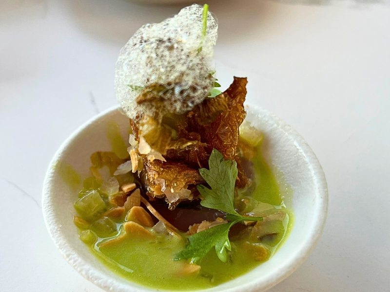 Hoewel we normaal bij fine dining voor een wijnpairing kiezen, hielden we het dit keer bij een fles witte wijn. We informeerden naar een fles uit Guardamar, en mochten die eerst proeven – klasse! Ze bleek iets té uitgesproken voor onze smaak, dus kozen we uiteindelijk voor een Sauvignon-stijl uit Navarra. Een perfecte match.