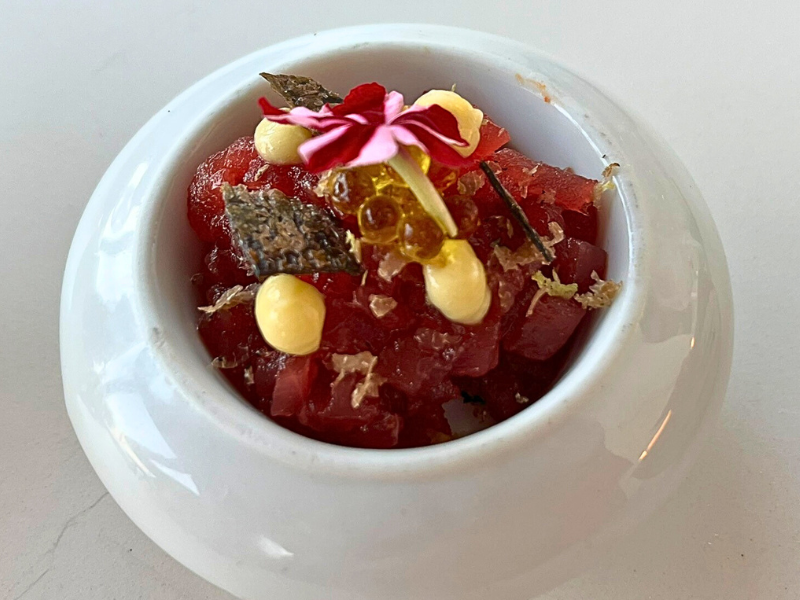 Omdat het onze laatste avond was, kozen we voor het ‘5 Senses’ menu (€60 p.p.). Niet goedkoop, maar vergeleken met België – waar je minstens het dubbele betaalt – een absolute topdeal. Het eten was dan ook van sterrenniveau: verfijnd, uitgebalanceerd en prachtig gepresenteerd.