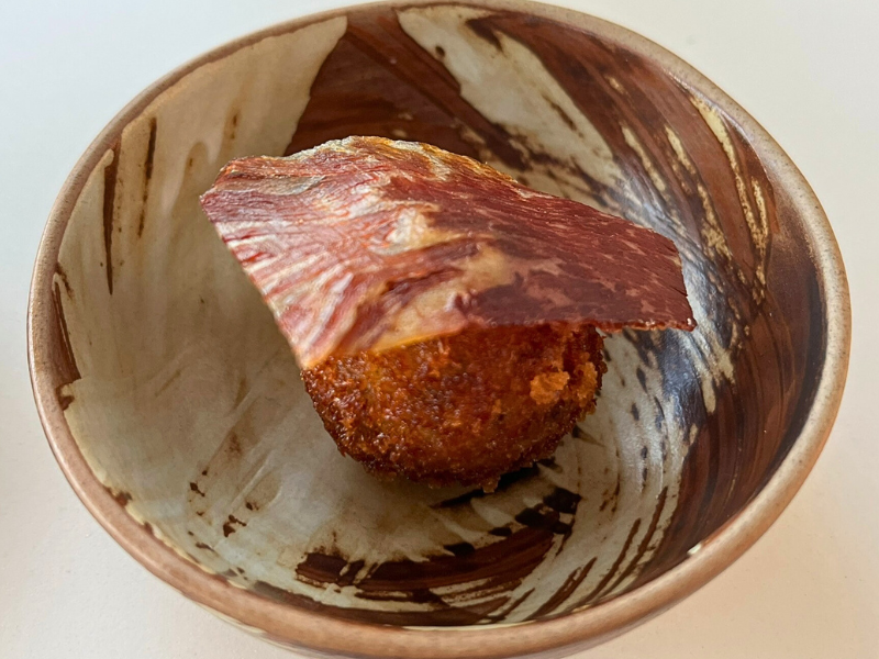 De menukaart moesten we inlezen via een QR code (maar je vindt ze ook op de website) en tot onze schrik zagen we enkel 3 voorgerechtjes, 3 hoofdgerechten en 4 desserts staan. Geen enkel gerecht kwam ons bekend voor. Dan maar de stoute schoenen aangetrokken en als starter op safe gespeeld door kroketjes te nemen. 2 kroketjes later wisten we al, “amaai, dit zijn geen gewone kroketten, maar TOP kroketten”.