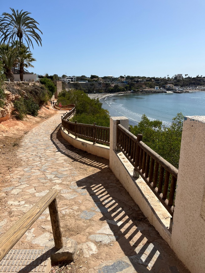 Wij hebben onze auto proberen te parkeren op Parking “Cerca Cabo Roig” (Calle Levante). Op het einde van de straat is er een trap die je op de wandelweg brengt naar het strand van Cabo Roig. Eenmaal het strand voorbij, zie je in de diepte de populaire bar/restaurantje La Bahia liggen. Wie net zoals wij daar een eerste indrink pauze wilt houden, kan zich neervleien aan een tafeltje met zicht op de baai.