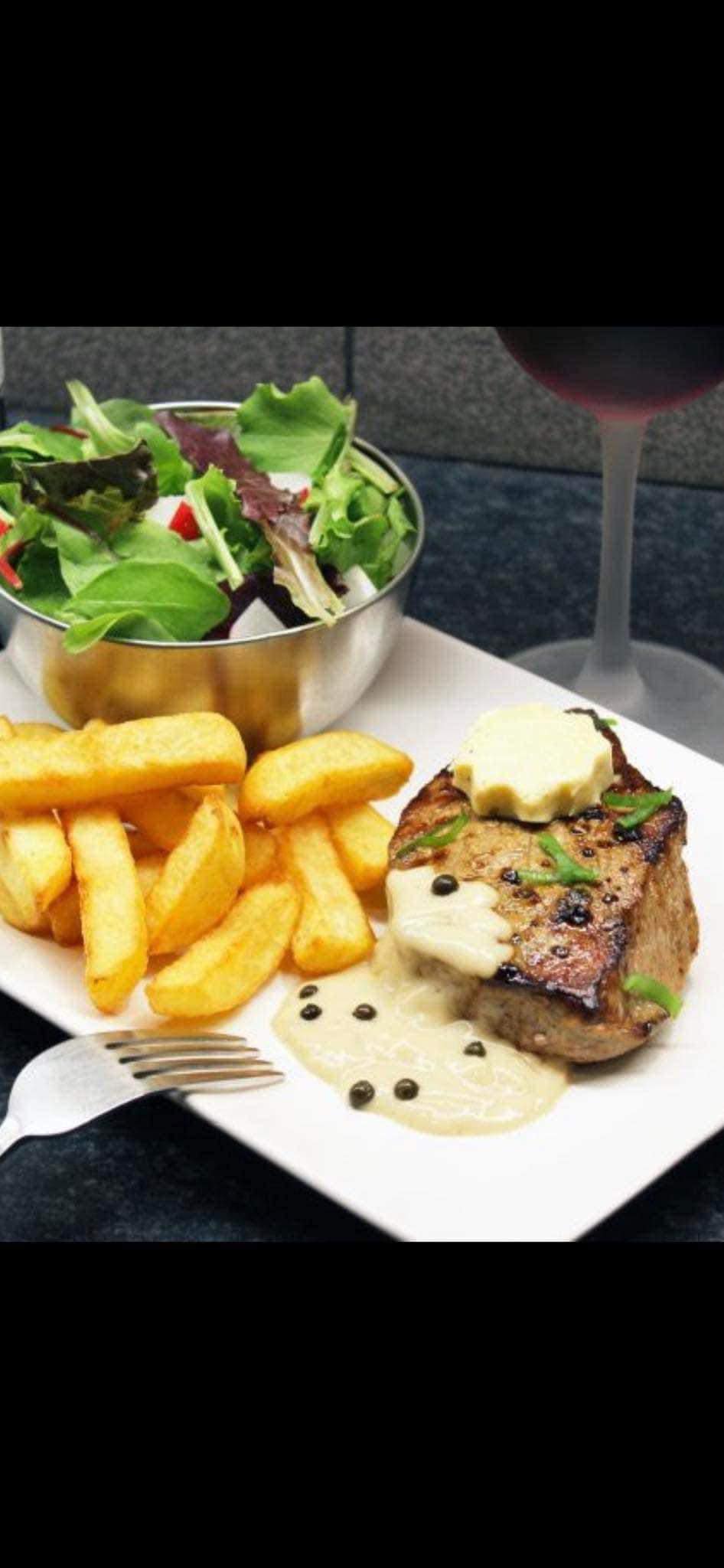 Voor het voorgerecht kozen we kikkerbilletjes en een trio van kroketjes. Beide gerechten kwamen mooi gepresenteerd en waren goed op smaak. Als hoofdgerecht ging de keuze naar een filet pur met frietjes en een vegetarische noedelschotel op Oosterse wijze. De filet pur was perfect gebakken, met een knapperig frietje zoals het hoort bij een Belgisch restaurant, en de noedelschotel was verrassend fris en smaakvol — een aangename verrassing voor wie liever wat lichter eet.