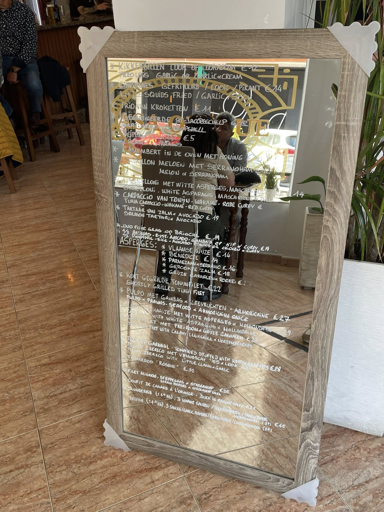 Het restaurant ligt in een rustige straat in Guardamar del Segura en oogt van buitenaf bescheiden. Binnen valt de inrichting op door een ietwat ouderwetse, sobere maar nette stijl – niets opzichtig, gewoon verzorgd en huiselijk. Het menu wordt gepresenteerd op een kartonnen pancarte, maar de echte charme zit in de suggesties: een grote spiegel waarop de eigenaar zelf de dagspecialiteiten heeft genoteerd en die hij met de glimlach tot aan je tafel brengt.