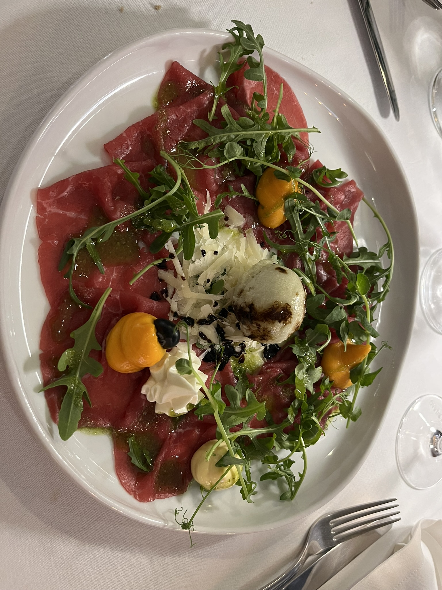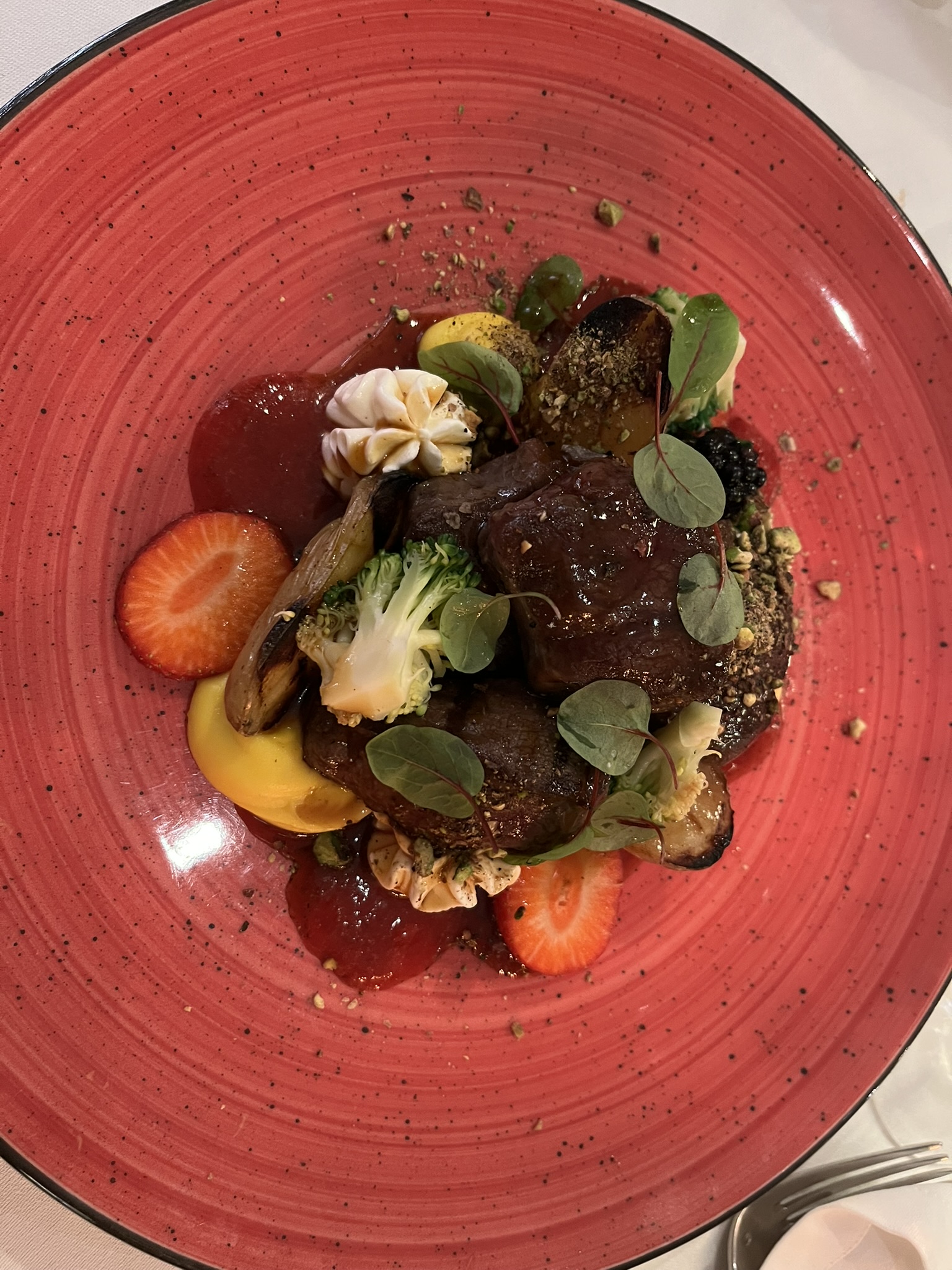 Het hoofdgerecht liet lang op zich wachten. De andere tafelgenoten vonden het lekker, maar mijn vlees was zo taai als een leren lap en bleef voor de helft liggen.