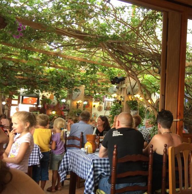Het restaurant is een familiezaak sinds 1973 en bevind zich naast de rotonde van Punta Prima (20 minuten rijden van ons appartement). Wanneer je uit je wagen stapt ruik je de geuren van gebakken vlees reeds van ver discreet zich in je neusgaten nestelen. Eens je de zaak binnenstapt, snap je waarom er “Patio” in de naam staat: de eetzaal ligt in een prachtige overdekte binnenplaats met wijnranken en vijgenbomen, hangende jasmijn bloemen en geraniums, de muren vol met Spaanse decoratie, enz. Je wordt dus als het ware binnengezogen in een authentieke Spaanse setting (met uitzondering van een grote tv aan de ingang, maar dat is dan weer voor de aan voetbal verslaafde Spanjaarden).