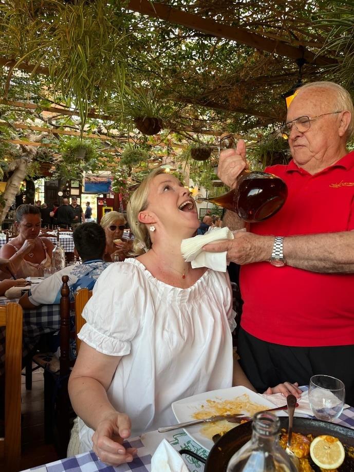 Het eten was trouwens overheerlijk van smaak én eerlijk in prijs: 6€ voor 7 gevarieerde kroketjes, 6€ voor een hééérlijke sangria, 1€ voor brood met aoli, 9.50€ voor een goede fles rosé huiswijn, 12€ voor een luchtige pizza, en daarna een lokaal, royaal dessert uit de regio Murcia. In totaal aten we voor nog geen 50 euro, animatie inclusief.