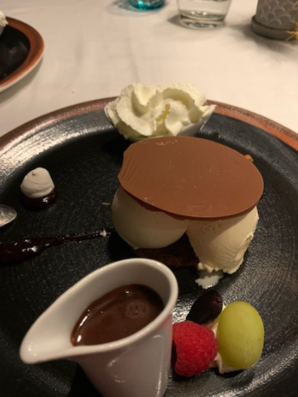 Het hoogtepunt was echter onze “Dama Blanca”. Twee bolletjes heerlijk vanilleijs op een kraakvers gekarameliseerd koekje, afgedekt met een chocolade schijf, enkele vruchtjes, smeuige slagroom en een kannetje warme Belgische chocolade. Luc Bellings zou hier minstens een 9/10 voor geven!