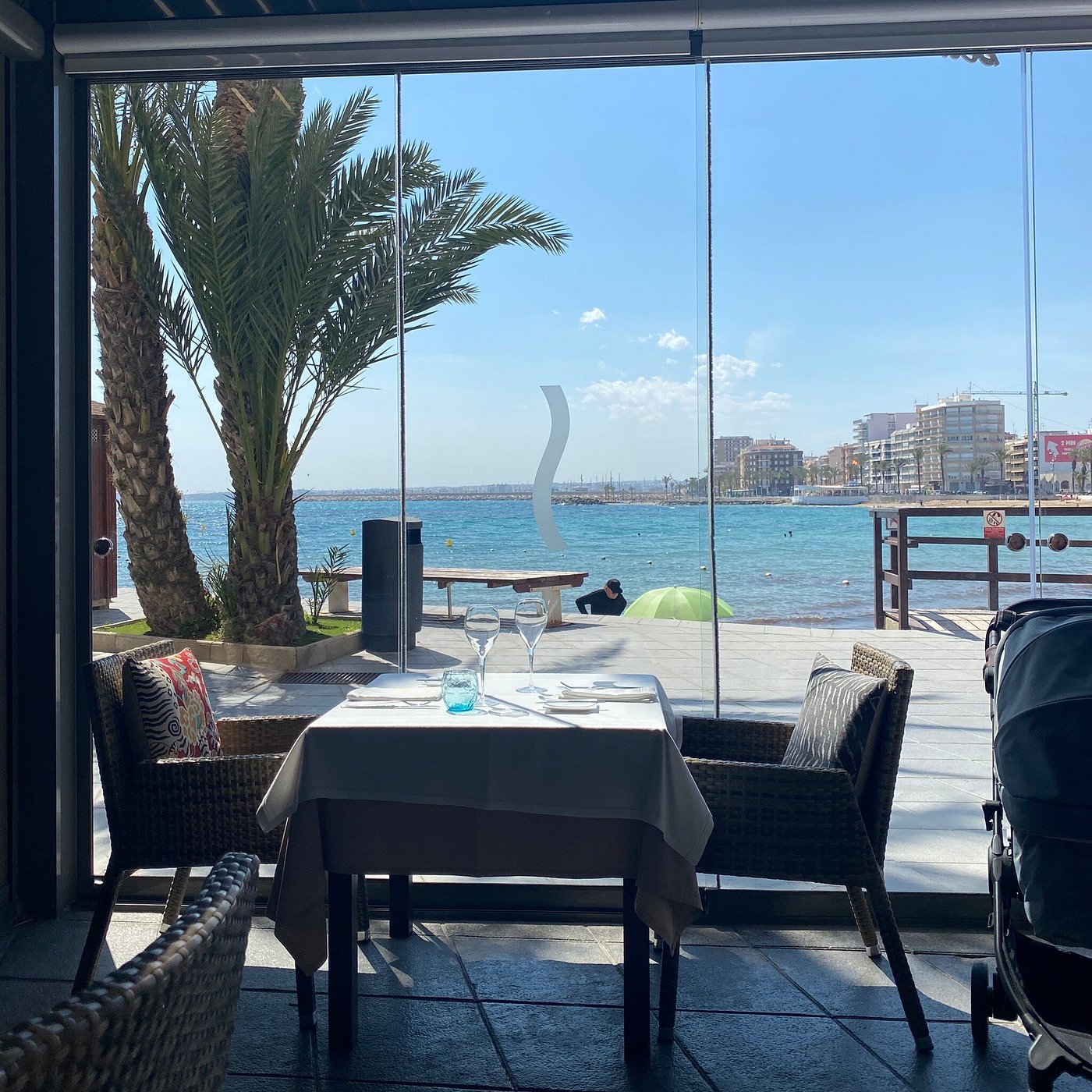 Reserveer wel op voorhand! In de zomer staat de veranda wijd open en krijg je bovenop je heerlijk eten ook een prachtig uitzicht over het water van de baai in Torrevieja.