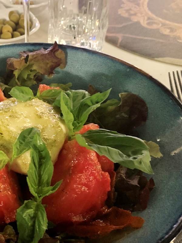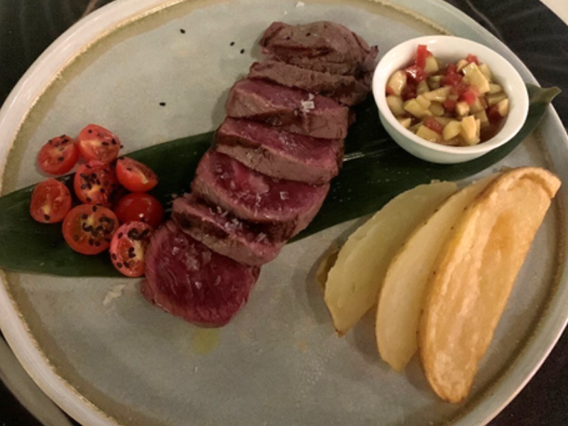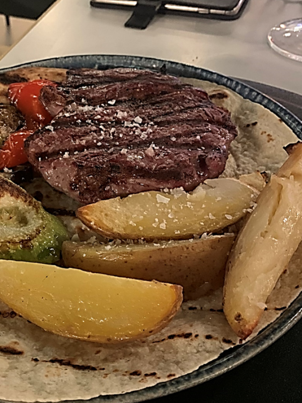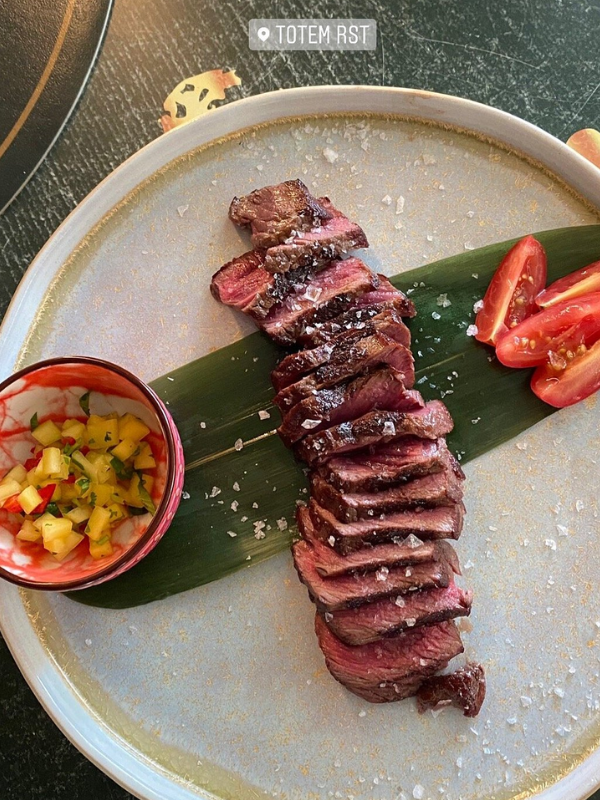 We waren met drie en ons tafelgezelschap, skipte het voorgerecht/in the centre en koos voor: een salade met burrata en een vleestomaat van ½ kilo, een Angus steak en een tataki van beef. Klinkt allemaal heel eenvoudig en saai, maar Totem zou onze favoriet niet zijn als er aan elk gerecht geen twist aan vast zat: de smaken waren fantastisch, de bordschikking ontzettend origineel. Mijn tataki (is vlees gesneden in schijfjes) werd opgediend onder een stolp waaruit een ganse wolk rook kwam. Het vlees was zo sappig als boter en doortrokken van een rook smaak. Dit was geserveerd op een mooi bord waar op de bodem een langwerpig decoratief blad lag. In een (echt) klein potje kwamen piepfijn gesneden groentenblokjes gedrenkt in een fantastisch smakend sausje. Yammie!