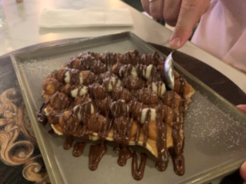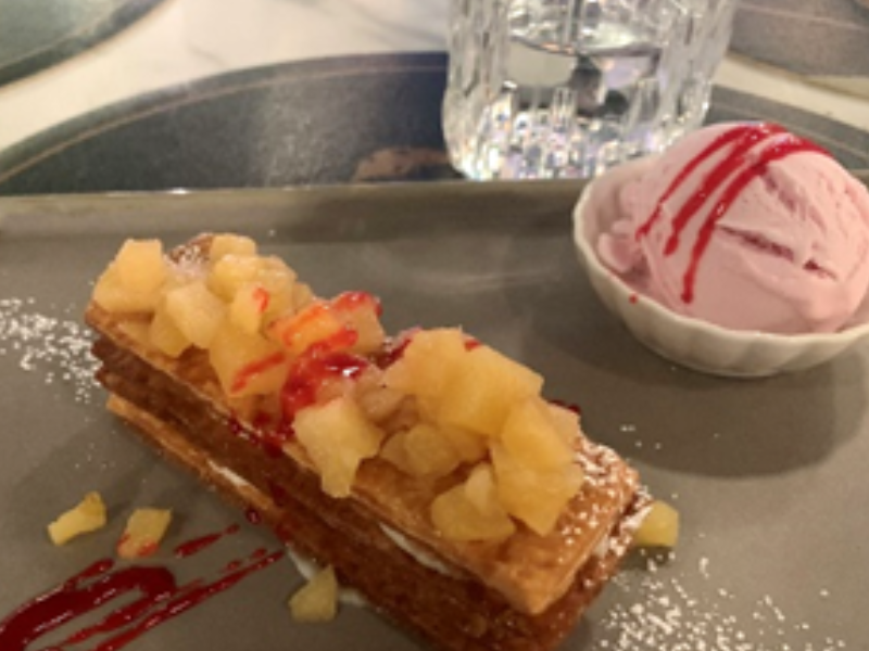 De textuur van het ijs was ongezien zacht en lekker. Katty’s nagerecht kwam op nummer twee: de millefeuille was luchtig en had effectief een lekker caramel krokantje. Mijn wafel kwam op nummer drie want ik vond ze nogal droog. Tenzij je er een koffie of theem bij drinkt, maar dat was niet het geval.