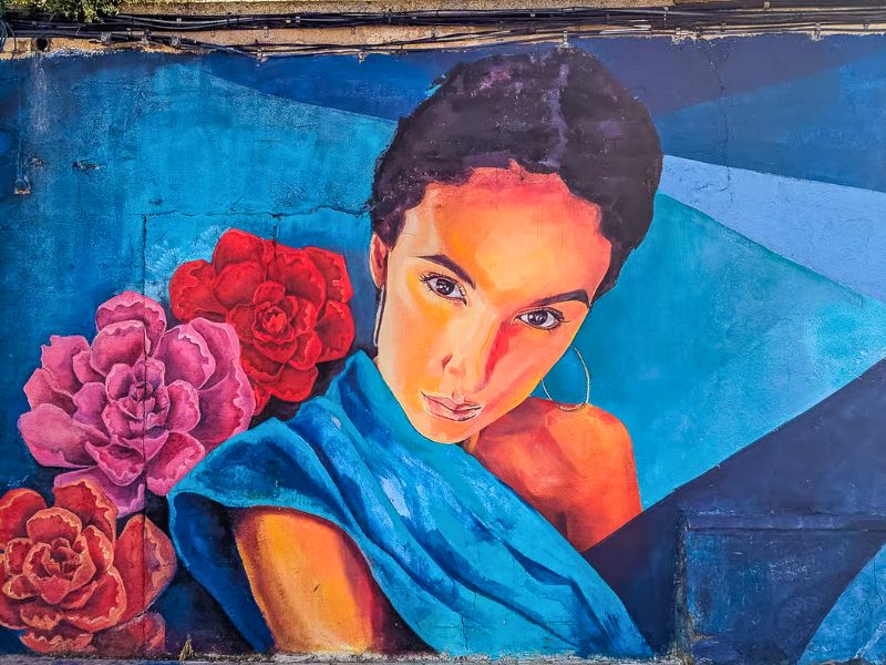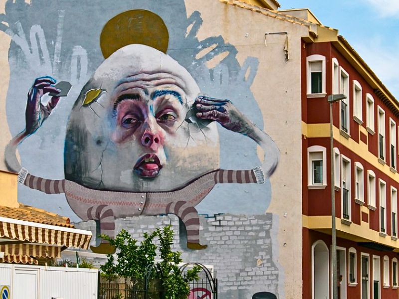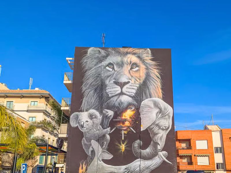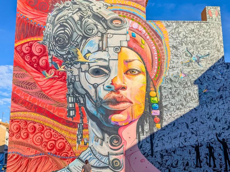 Van daaruit trokken we even het centrum in richting het toerismebureau. Los Alcázares heeft namelijk een verrassend leuke street-art route. Doorheen de stad vind je tientallen muurschilderingen op gevels van huizen en gebouwen. Het toerismebureau heeft een wandelkaart waarop de verschillende locaties aangeduid staan. Sommige schilderingen zijn gigantisch groot en echt indrukwekkend om te zien. Het geeft de stad een creatieve toets die je niet meteen verwacht in een badplaats.