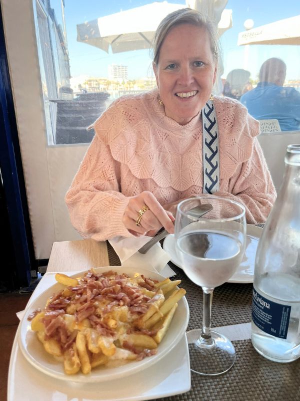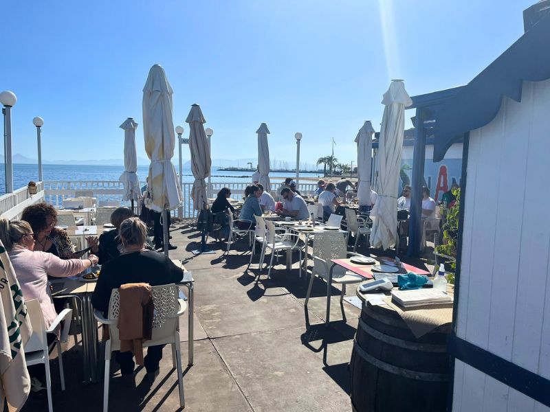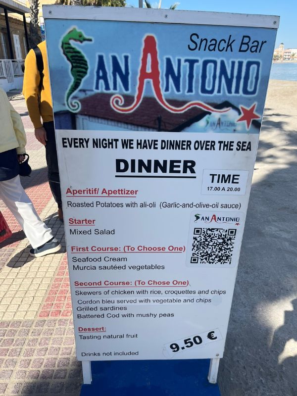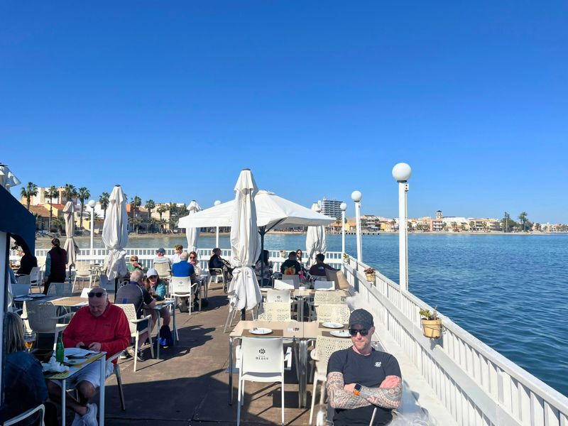 Ons plan was om te gaan lunchen bij Restaurante San Antonio, een restaurant dat op een steiger in het water ligt. Alleen al de ligging maakt het bijzonder. Je zit letterlijk boven de Mar Menor, met uitzicht op de kleine vissersbootjes die voorbijvaren. De prijzen zijn verrassend vriendelijk. Er is zelfs een menu del día voor ongeveer 9,50 euro, wat voor Spaanse begrippen al goedkoop is, laat staan op zo’n locatie.