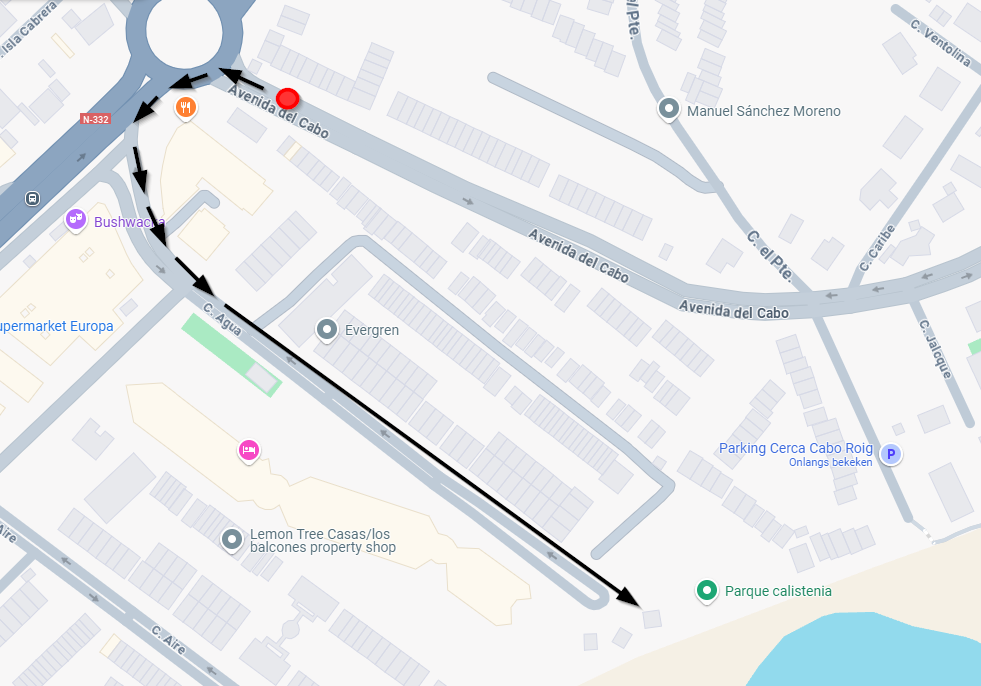 Kleine anekdote: vanuit Parking Cerce Cabo Roig naar Calle Ague gaan is een hele sinecure omdat je terug de grote baan N-322 op moet, en dan een hele grote omweg moet doen. Een goed tip is dus je wagen te parkeren aan het begin van Avenida del Cabo (zie rode bol op kaart hieronder), en daarna te voet naar Calle Agua tot je de zee bereikt.