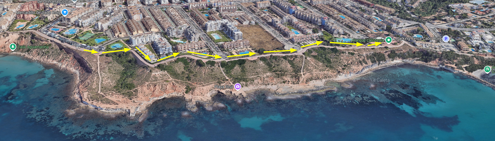 Zogezegd zo gedaan. We vertrokken vanaf het startpunt van Cabo Roig naar Playa Flamenca (Parking “Cerca Cabo Roig” - Calle Levante), maar na 2 minuten kwamen we tot de vaststelling dat we vanaf deze parkeerplaats onmogelijk naar de andere kant konden doorsteken. Een snelle blik op Google Maps leerde ons dat we met de wagen naar een eerdere straat moesten, nl Calle Agua.